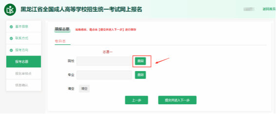 14.出现学历已认证通过后,点击“提交并进入下一步”后,“报考志愿”一栏如下,点击院校后面的“查询”按钮。
