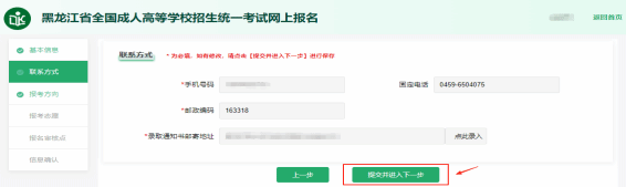 9.“联系方式”一栏如下,“录取通知书邮寄地址”,务必准确填写,填写完成后点击“提交并进入下一步”。