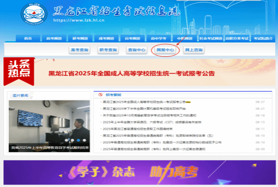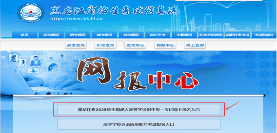 2.进入网报中心后,点击“黑龙江省2025年全国成人高等学校招生统一考试报名入口”。