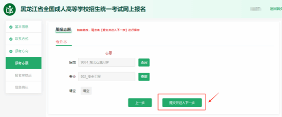10.“报考方向”一栏如下,请认真填写,填写完成后点击“提交并进入下一步”。