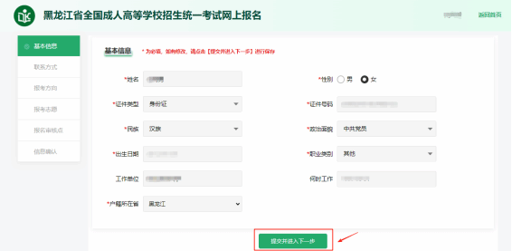 8.进入报名信息填写界面,“基本信息”一栏如下,请认真填写,填写完成后点击“提交并进入下一步”。