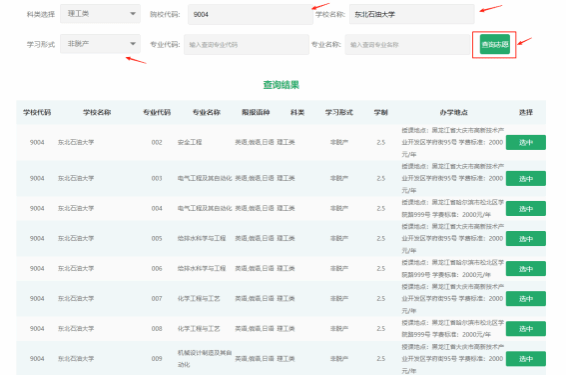 16.在查询结果界面,选择自己所报考专业,点击“选中”。此处需注意,有的专业后面有两个授课地点,请根据自己实际情况进行选择,因为涉及后续线下授课和线下考试等教学培养事宜。填写完毕后,点击“提交并进入下一步”,