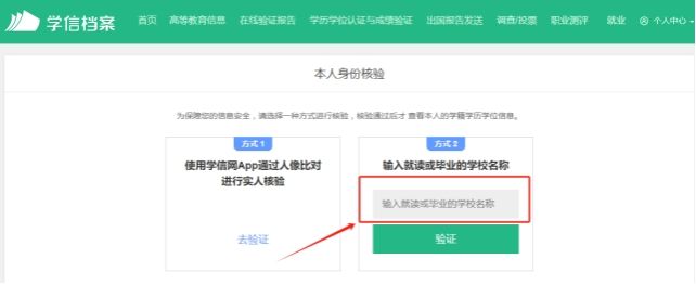 第五步,提示本人身份核验:一般选择方式2:“输入就读或毕业的学校名称”——输入学校名称“永利官方网站”