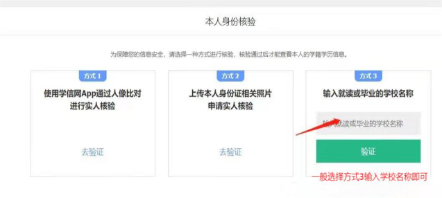 第五步,如果长时间未登录学信网,会提示本人身份核验:一般选择方式3:“输入就读或毕业的学校名称”——输入学校名称“永利官方网站”